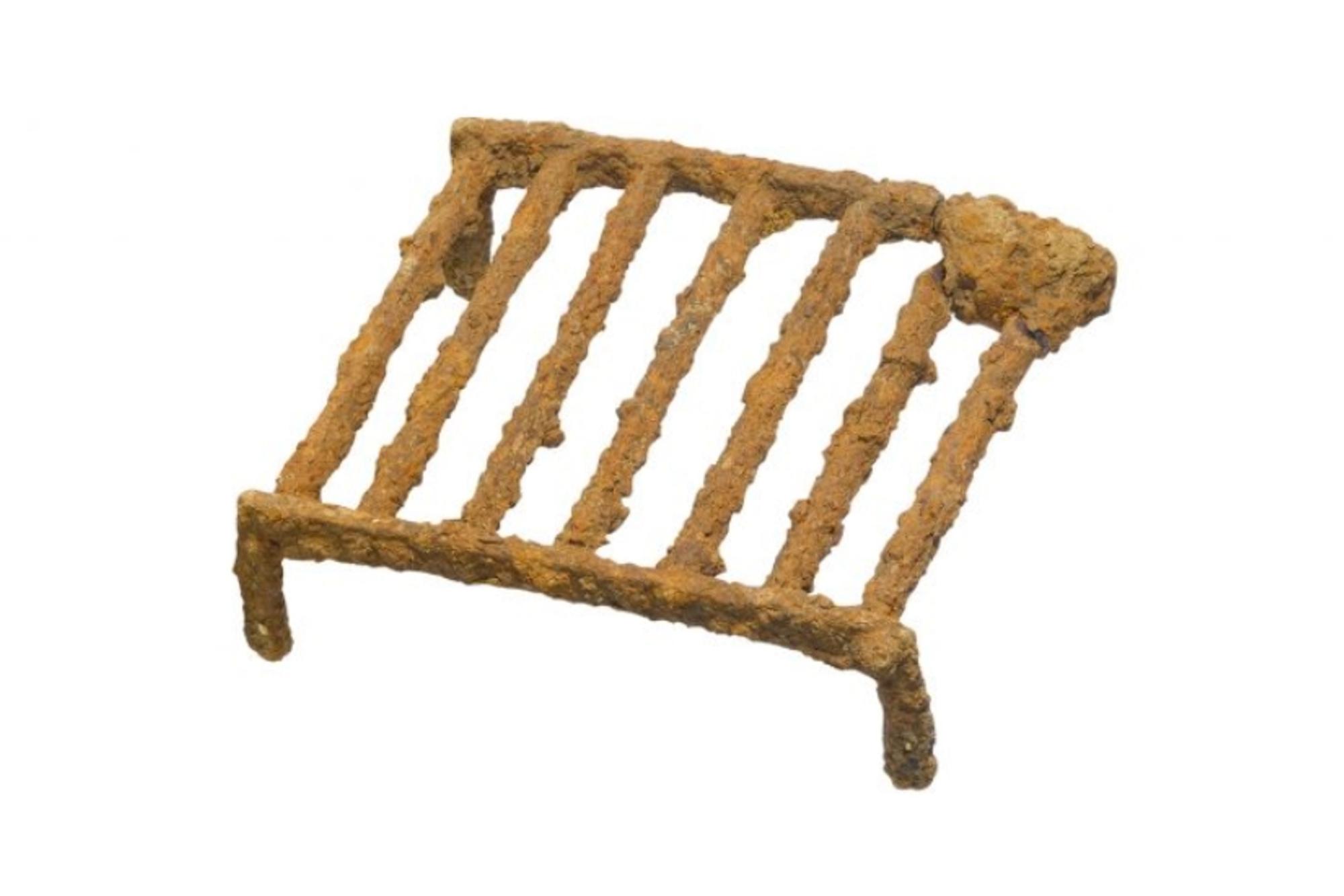 A gridiron is a metal framework that could be placed over a fire to provide a surface to cook on. This iron example formed a grill. Objects of this type are unknown in pre-Roman Britain, but can be found across the Empire. Other examples have been found in Colchester and Silchester, in France, Germany, Austria, and Switzerland, while a mosaic in the Rio Verde villa in Marbella, Spain, depicts a gridiron alongside meat, vegetables, and other cooking equipment, including knives, spatulas, and tripod stands.
