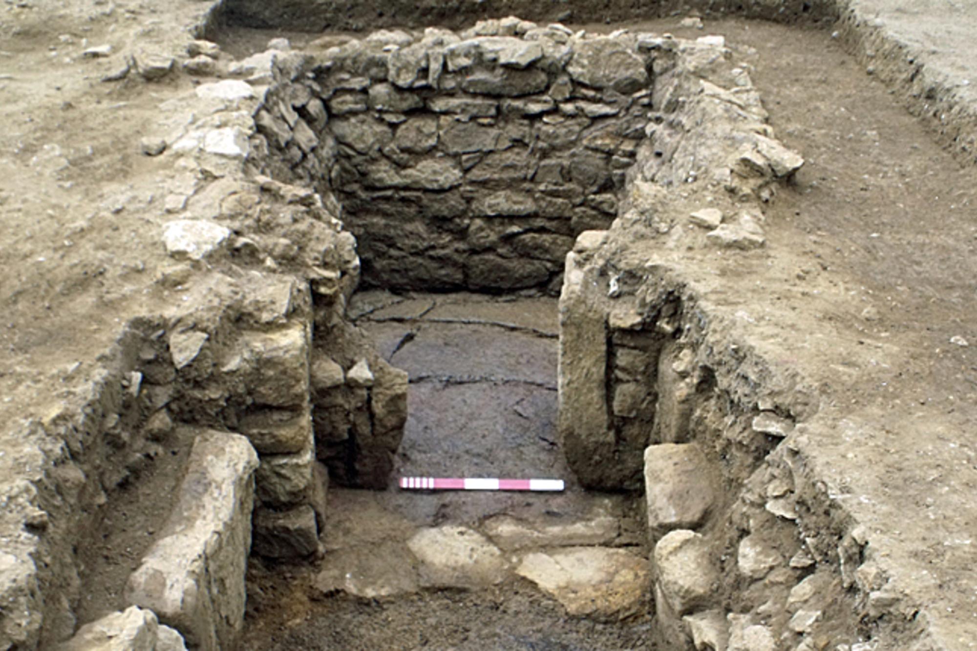Above ground, the kiln would have had a squat, thick-walled shaft, with a broad vent in the roof, but only the sunken chamber and stoking pit survived. The walls of the narrow stone-lined flue, linking the stoking pit to the chamber, where the fire was built, showed scorch marks from years of usage. Smouldering charcoal from the fire was probably pushed further into the chamber to provide the heat for drying.