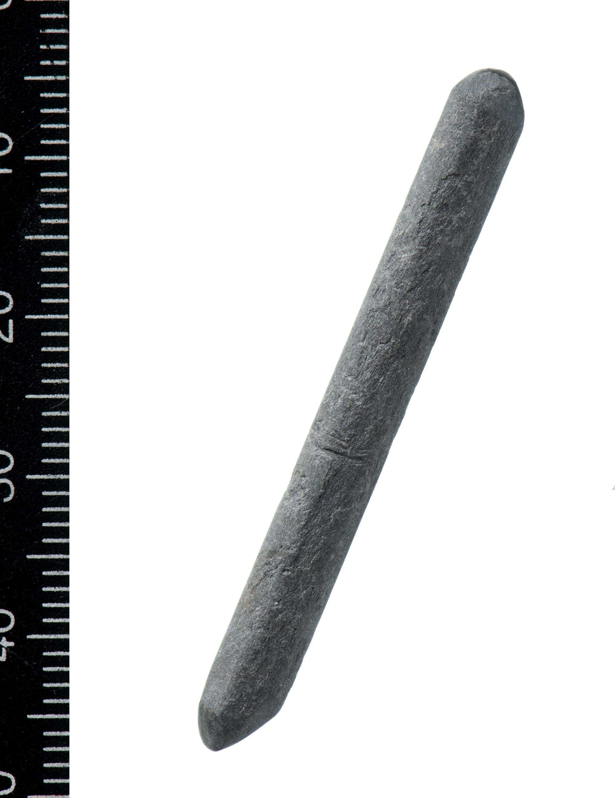 This is the corner of a reusable slate tablet, and the pencil used to write on it. Children would have used chalk or slate pencils to copy down from the blackboard or practice their handwriting and rubbed them clean for the next lesson. Can you spot any letters or names scratched into them?